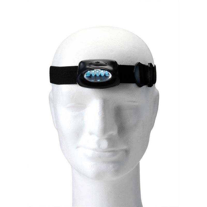 Torche frontale avec 5 LED dans un boîtier en plastique et sangle pour réglage de la tête